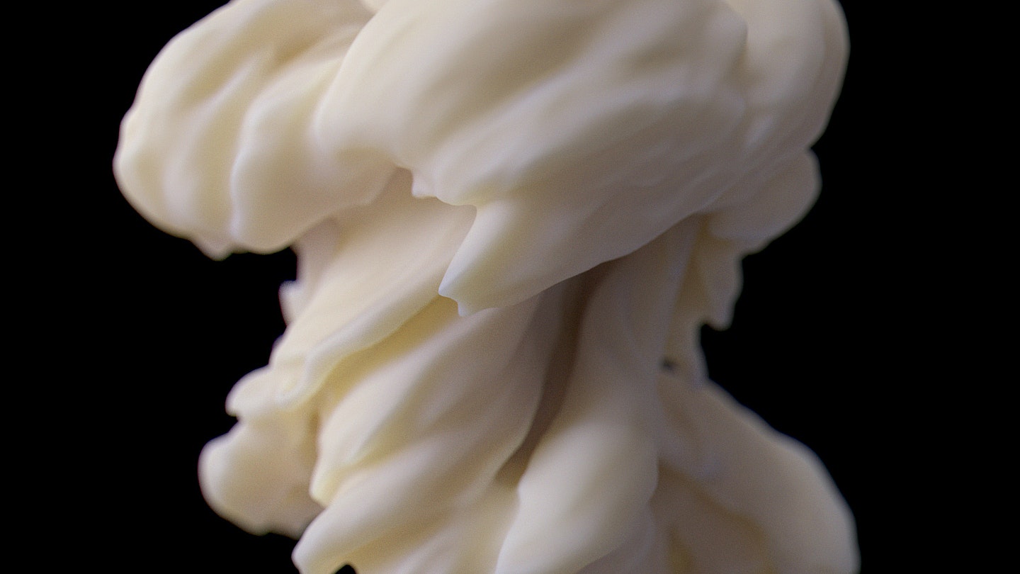 Direction for spicy cheese was the hardest to find. References for this cheese were hot lava. Talented ManV team made few simulations that i had a chance to render. The results were looking good but we doubt that this looks very eatable. I gave a shot with rendering smoke as geometry. I really loved white bubbles in the simulation start. Looked like something hot - BINGO! Client liked this direction so we kept it.